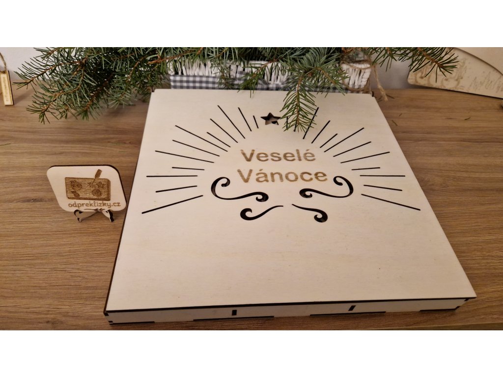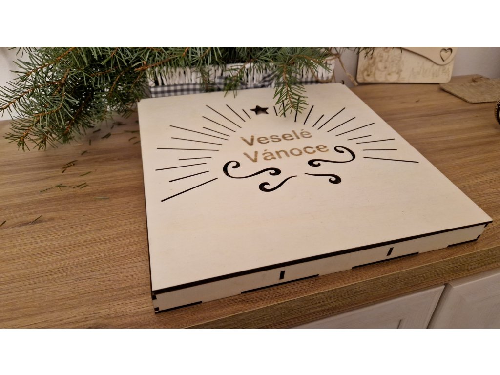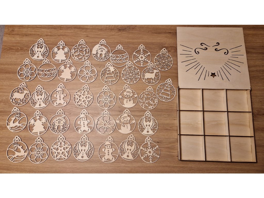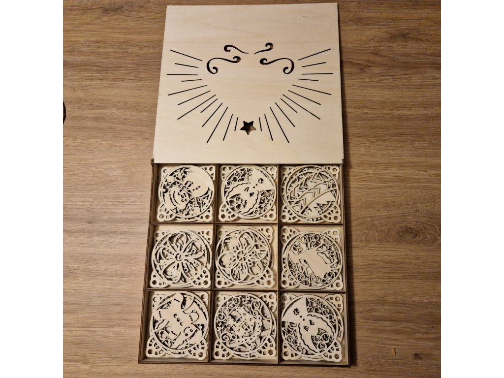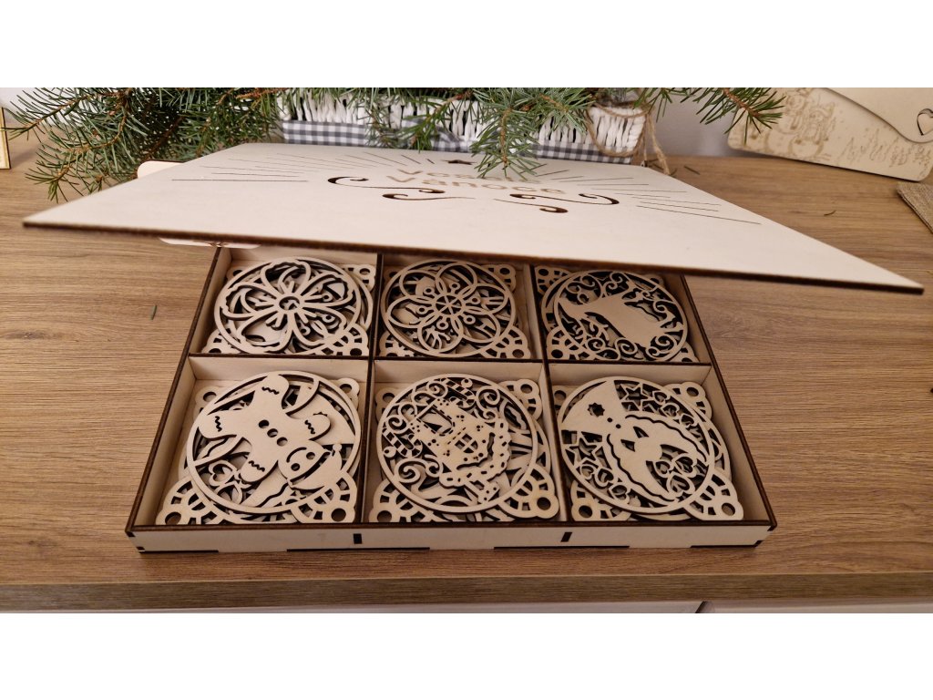V krabičce o rozměru 28 × 28 cm najdete celkem 36 ozdob (10 × 8 cm), rozdělených do devíti elegantních přihrádek. Každý motiv je pečlivě vyřezaný z topolové překližky o síle 3 mm a díky jemným detailům působí ozdoby vzdušně a něžně.